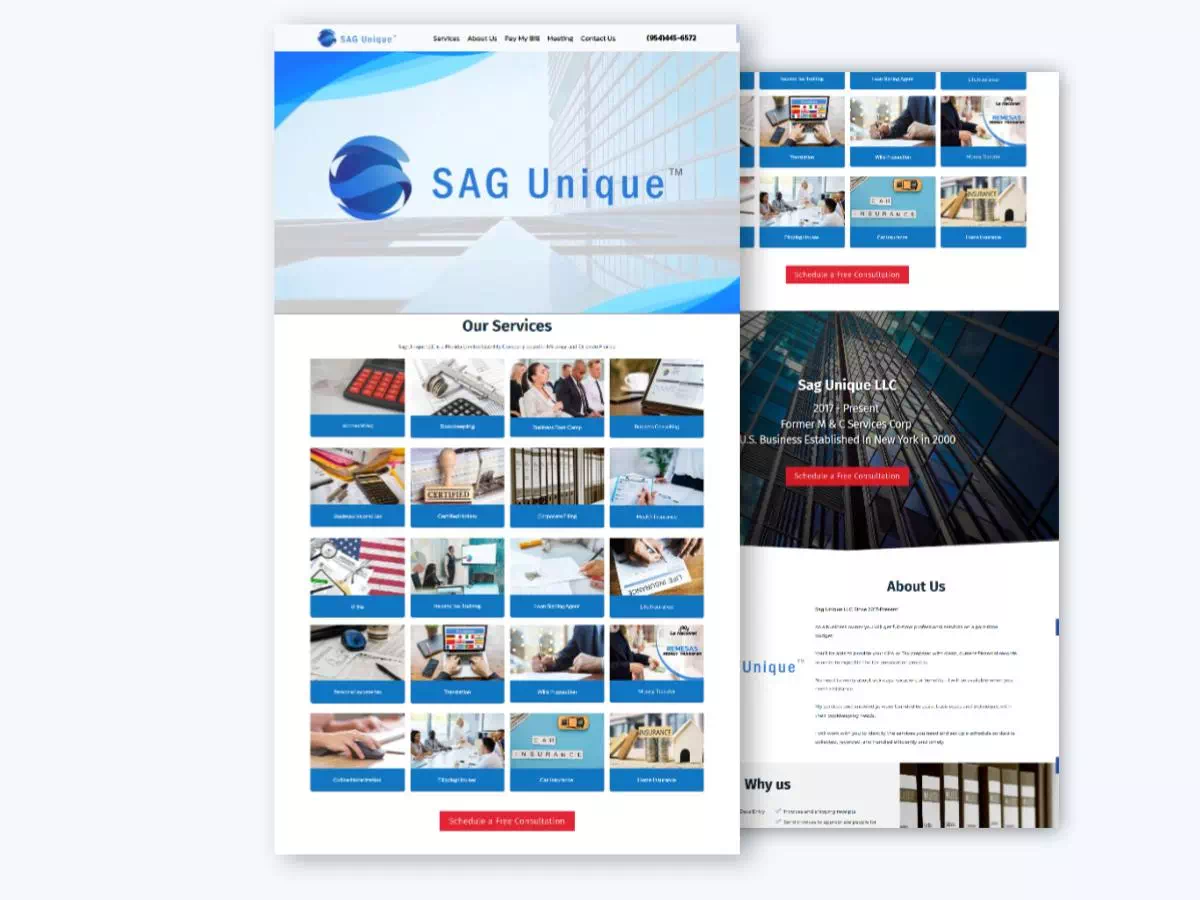 SAG Unique LLC, based in Miramar and Orlando, Florida, offers a wide range of services including accounting, bookkeeping, tax preparation, business consulting, and insurance solutions. With a commitment to supporting both individuals and businesses, they provide personalized services such as income tax training, notary services, and corporate filings. We developed their website to reflect their diverse offerings and dedication to client success. The site features a user-friendly, responsive design that facilitates easy navigation through their comprehensive services, enabling clients to access resources, schedule consultations, and manage payments efficiently.